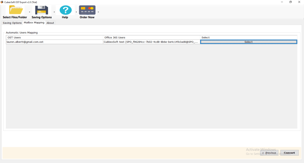 When you click the Connect button the tool will start connecting to O365 account and displaying the screen of Mailbox Mapping. It will appear three tabs that contain OST users, Office 365 users, and select. Then, hit on the “Select” tab; choose required Office 365 account in which you need to export OST items. Then, click Convert to start the process of moving OST files into Office 365 account.